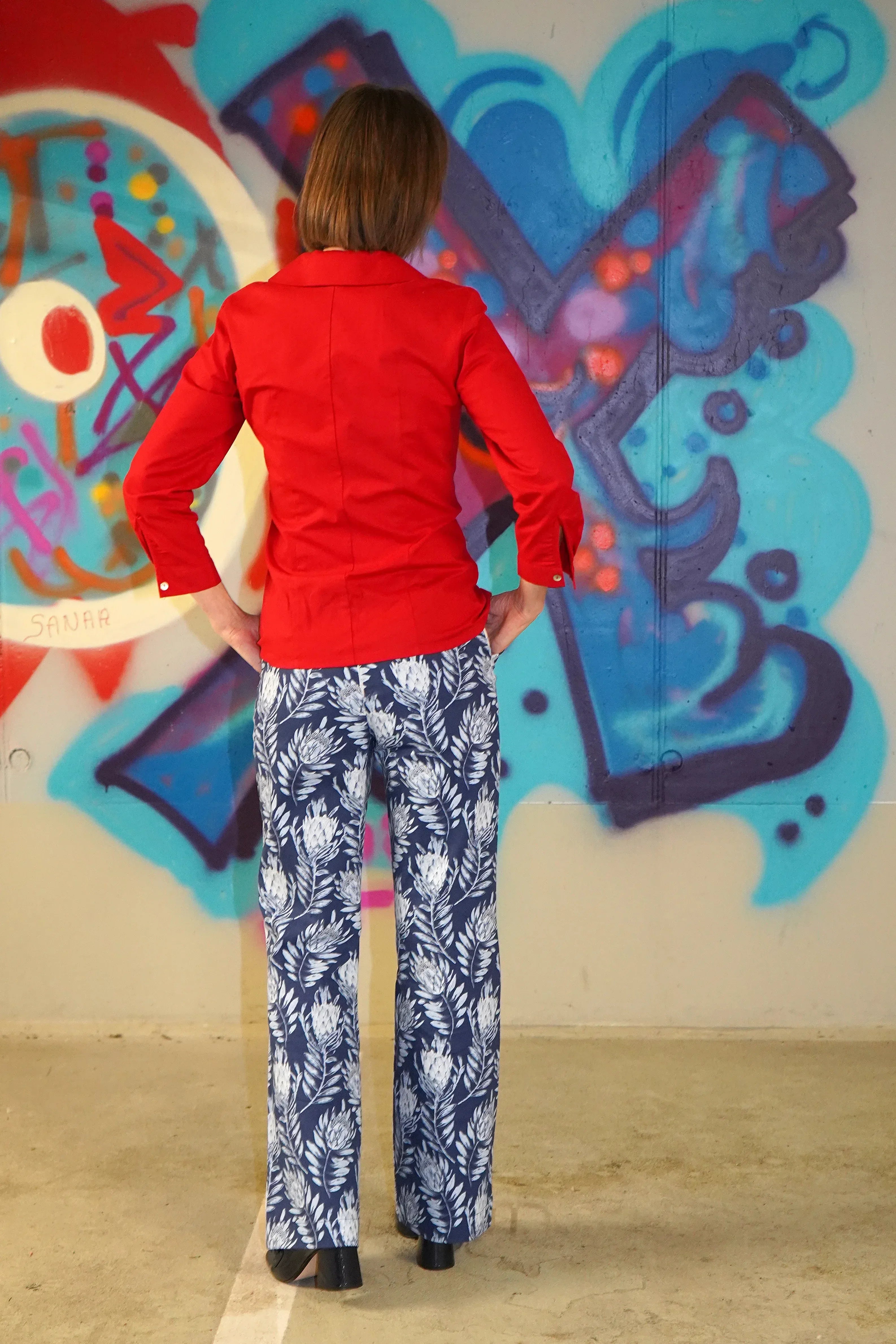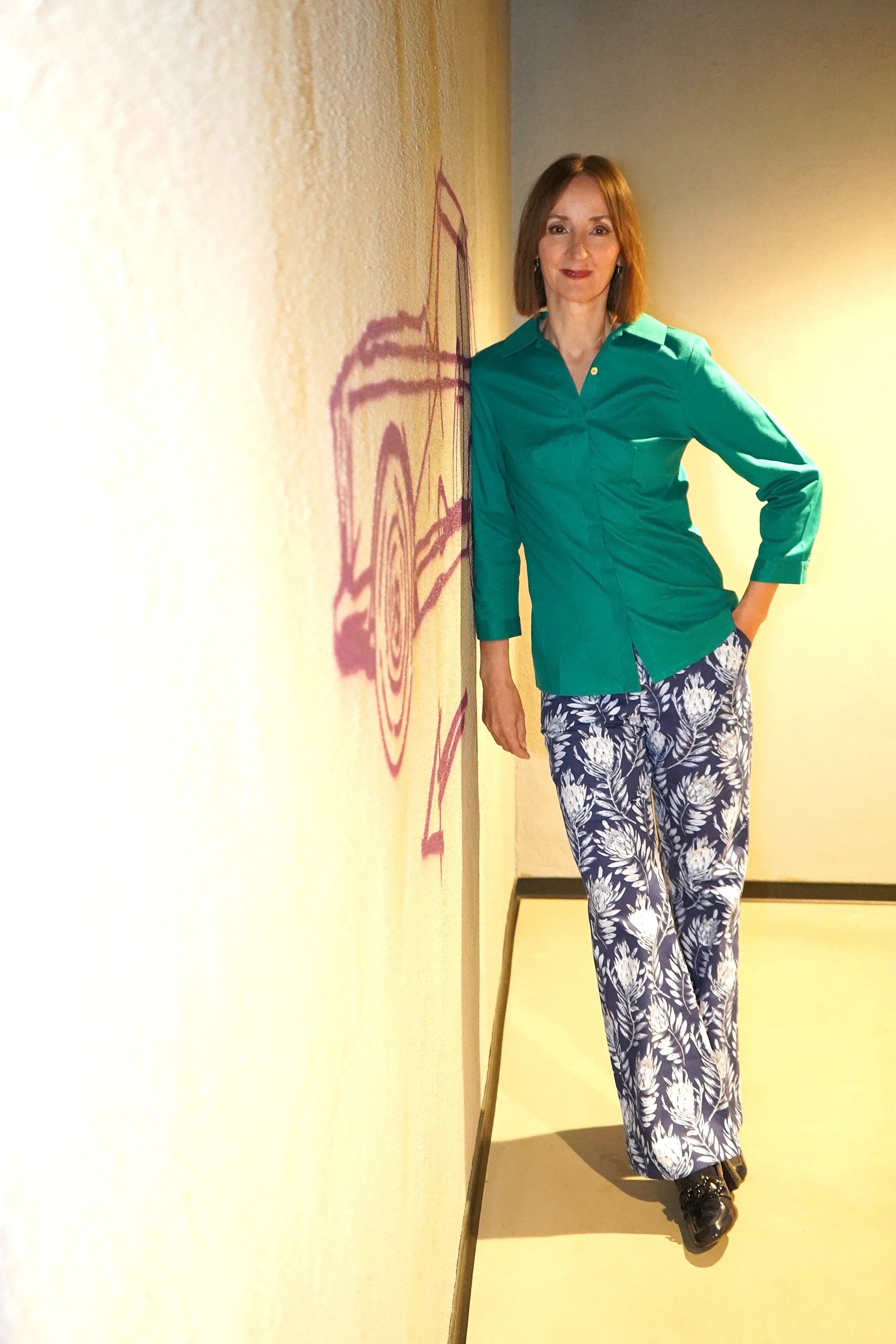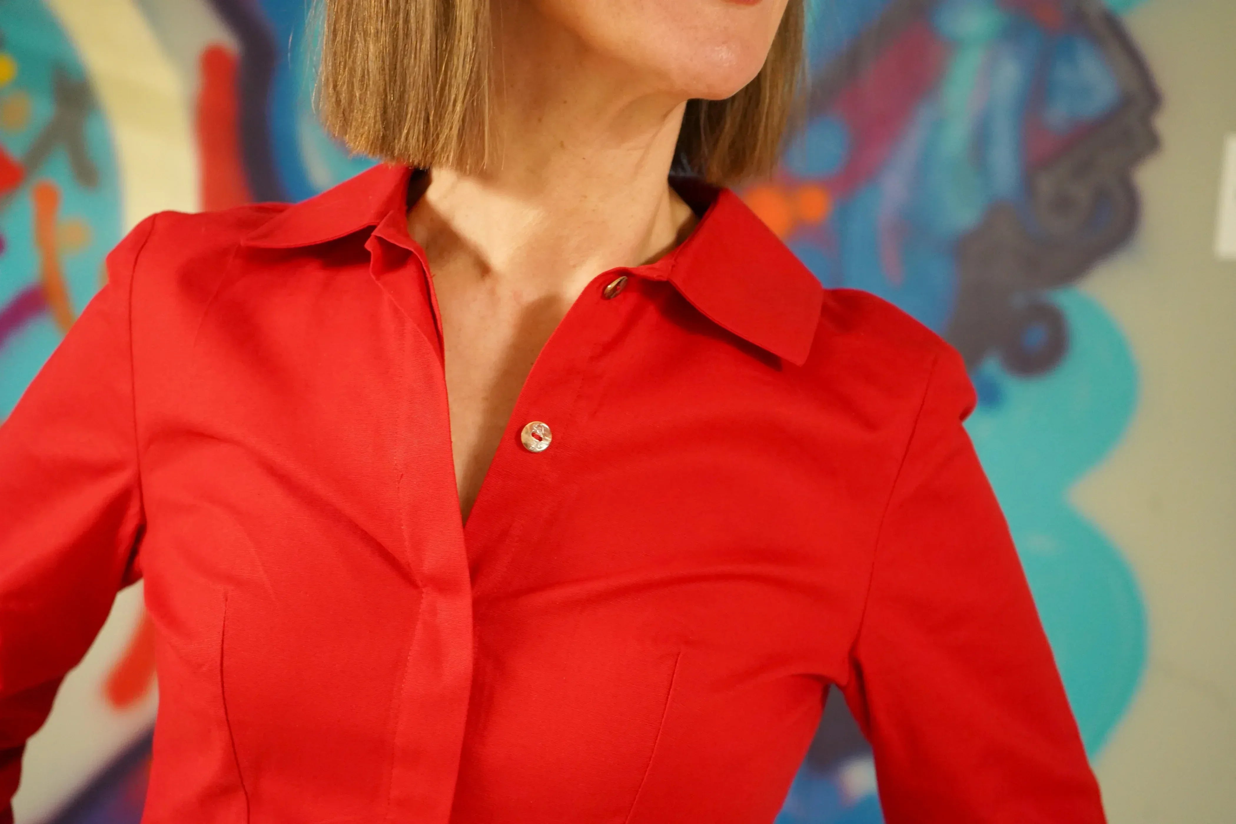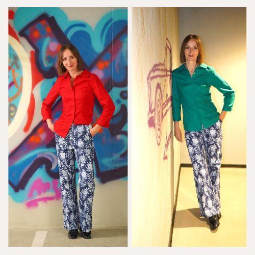 Immer im Gespräch bleiben. Stylisch ist die Bluse allemal, die hochgeschlossen getragen werden kann. Am besten mit einem couturigen Bleistiftrock oder auf einer Hüfthose oder was ich grad sehr gerne trage, einfach auf die Jeans. Sabina trägt die Größe 36.