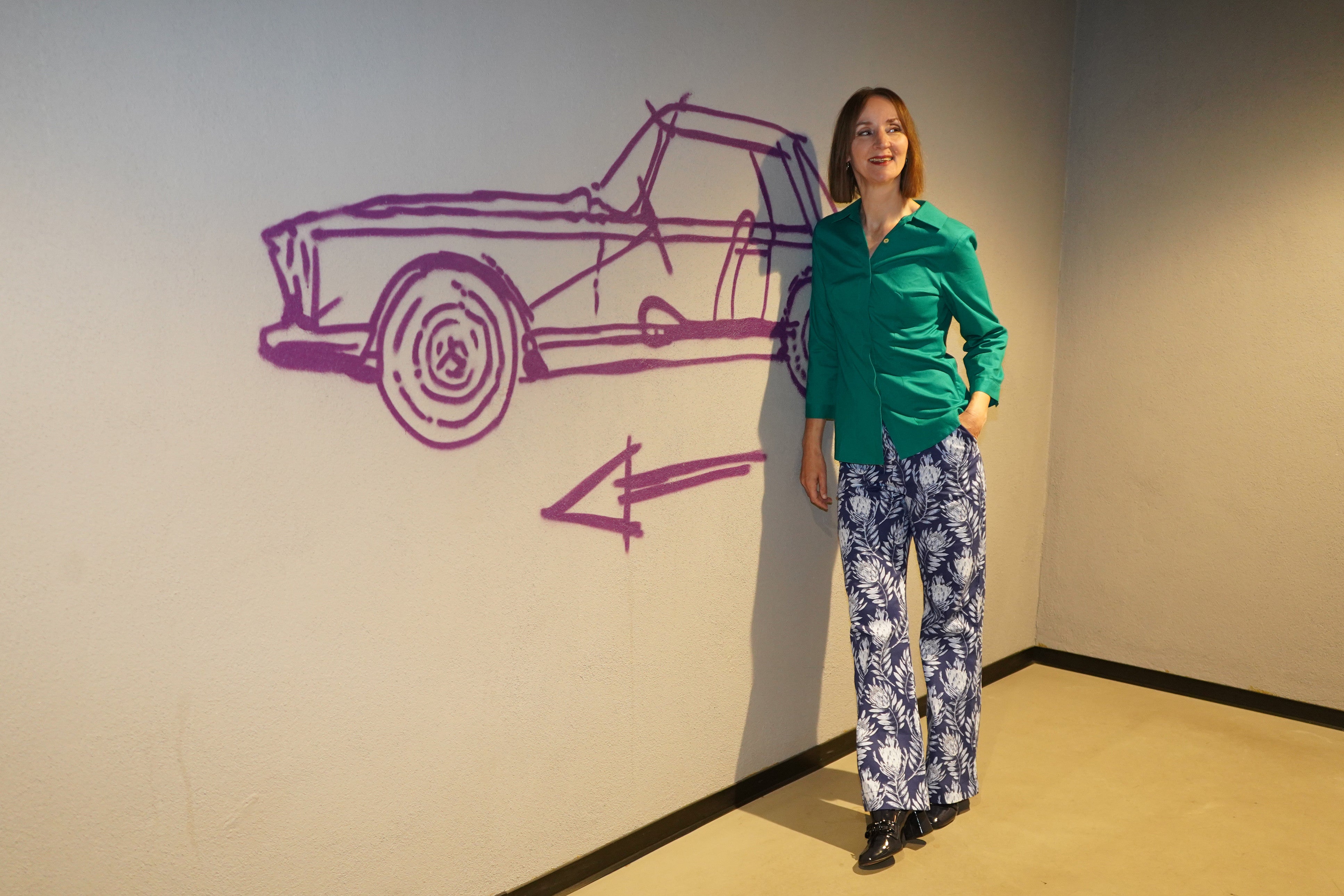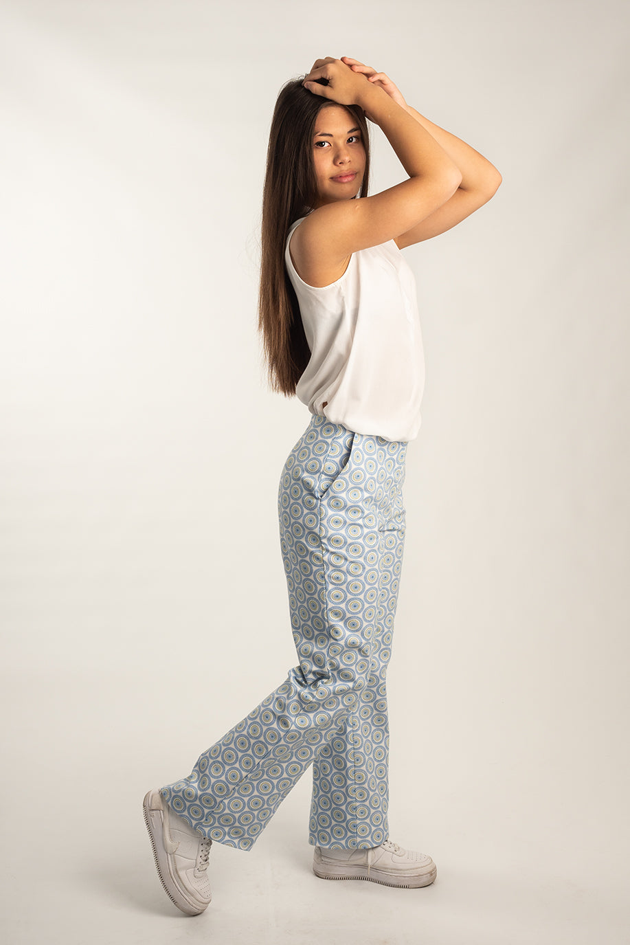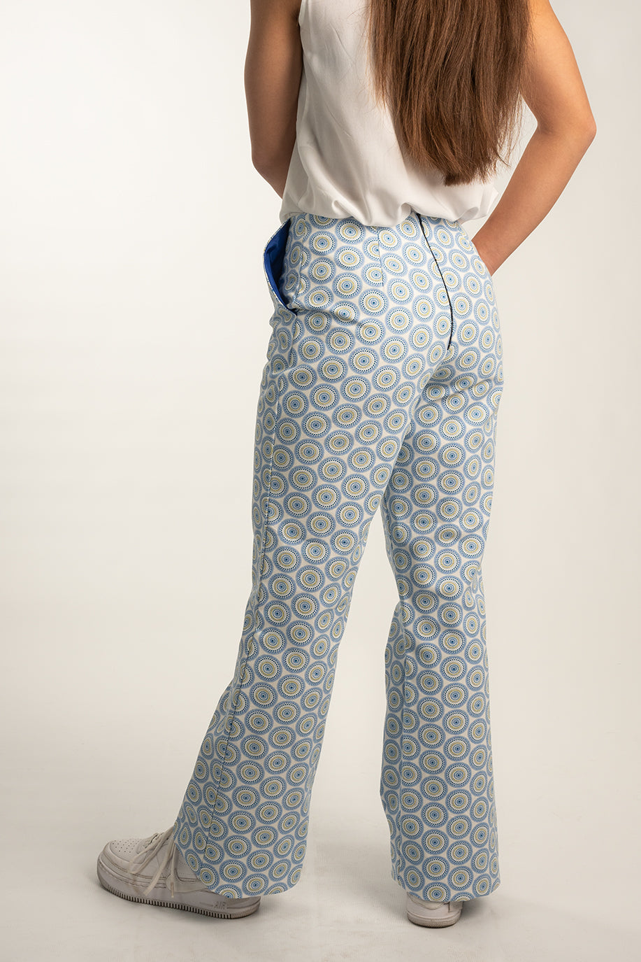 Unser Model trägt eine Hose in der Größe 38. Sie ist 166 cm groß.