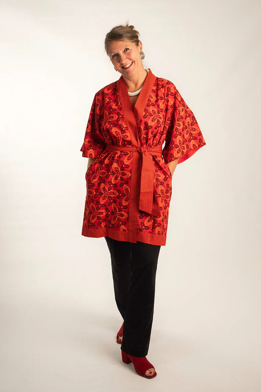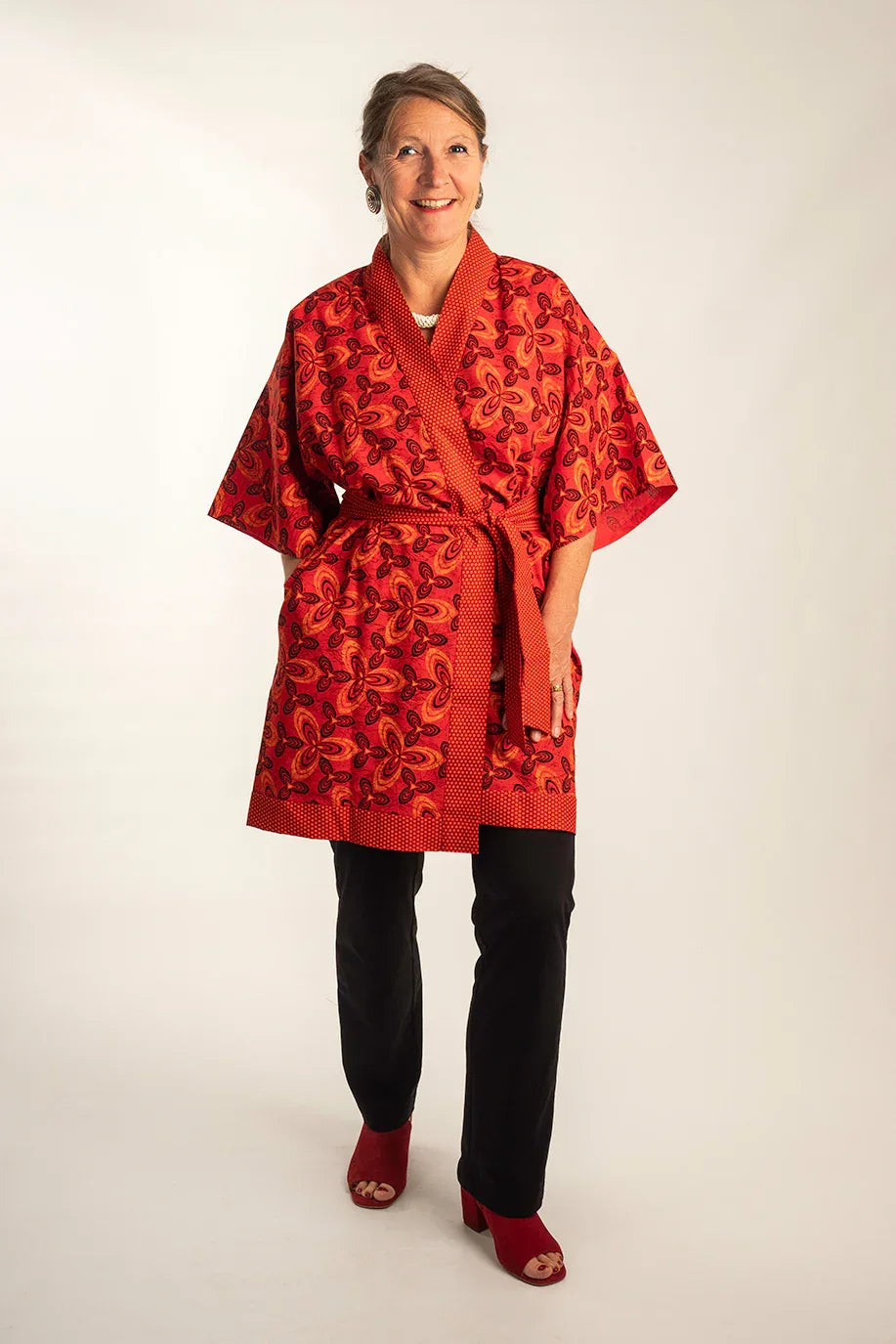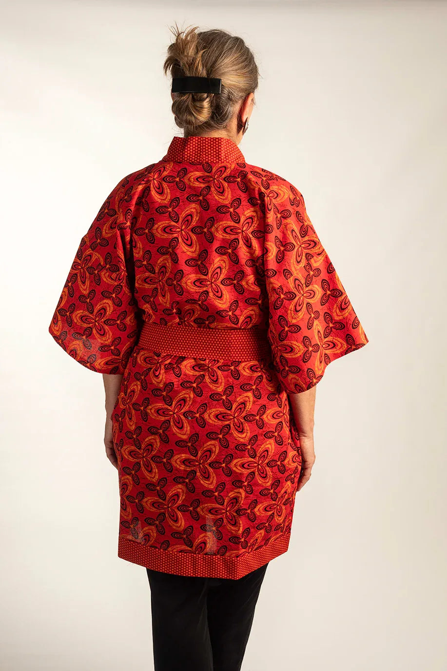 Japanisch für Anfänger: Der klassische Kimono in Wickeloptik und breitem Gürtel ist auch im Alltag als Tunika ein Schmuckstück und kann wunderbar zu einer schwarzen Marlenehose oder Jeans getragen werden.
