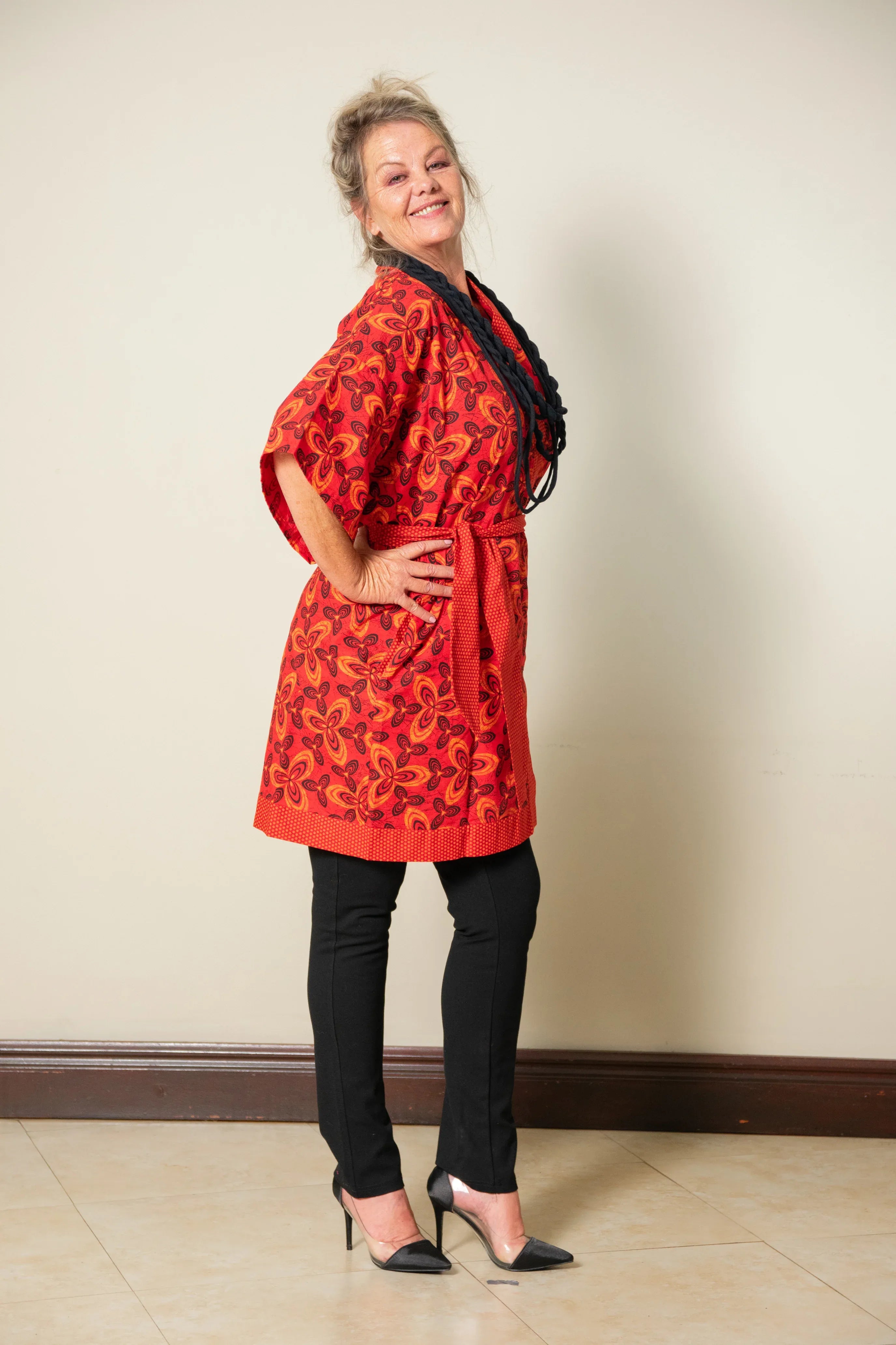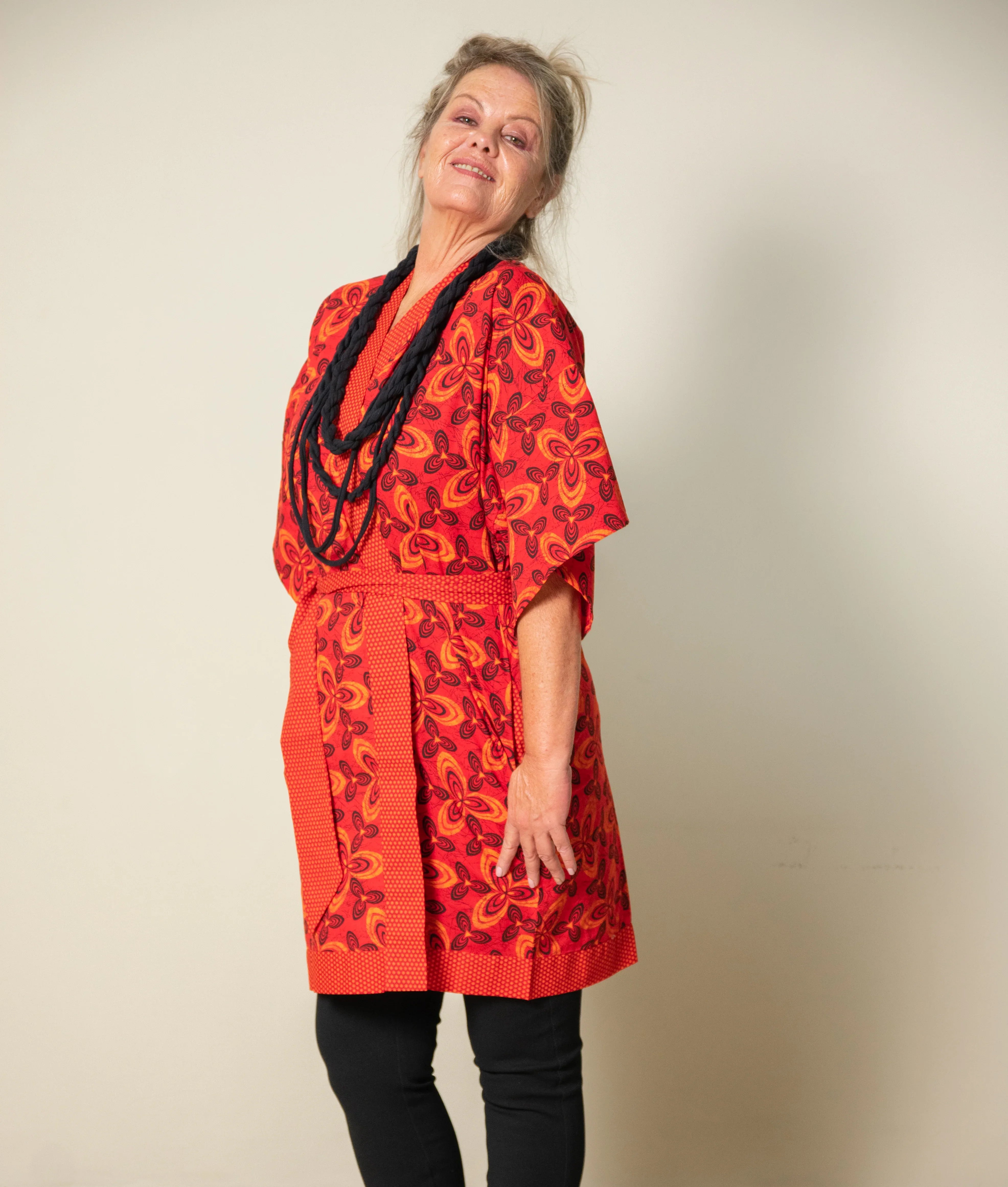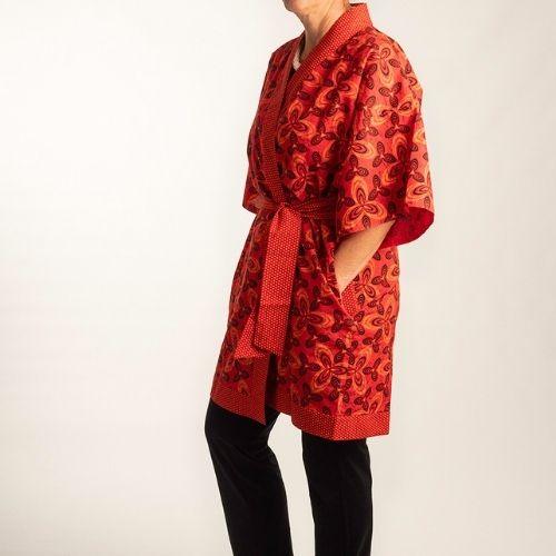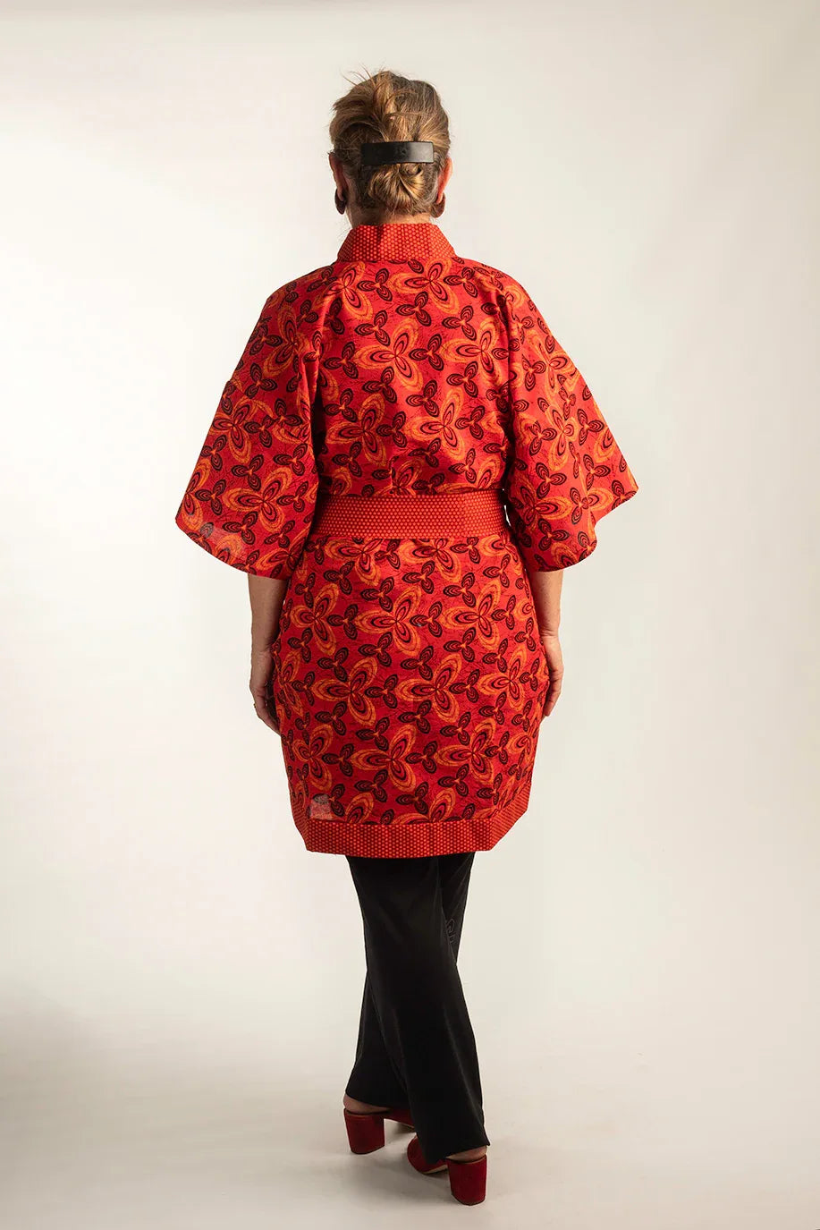 Japanisch für Anfänger: Der klassische Kimono in Wickeloptik und breitem Gürtel ist auch im Alltag als Tunika ein Schmuckstück und kann wunderbar zu einer schwarzen Marlenehose oder Jeans getragen werden.