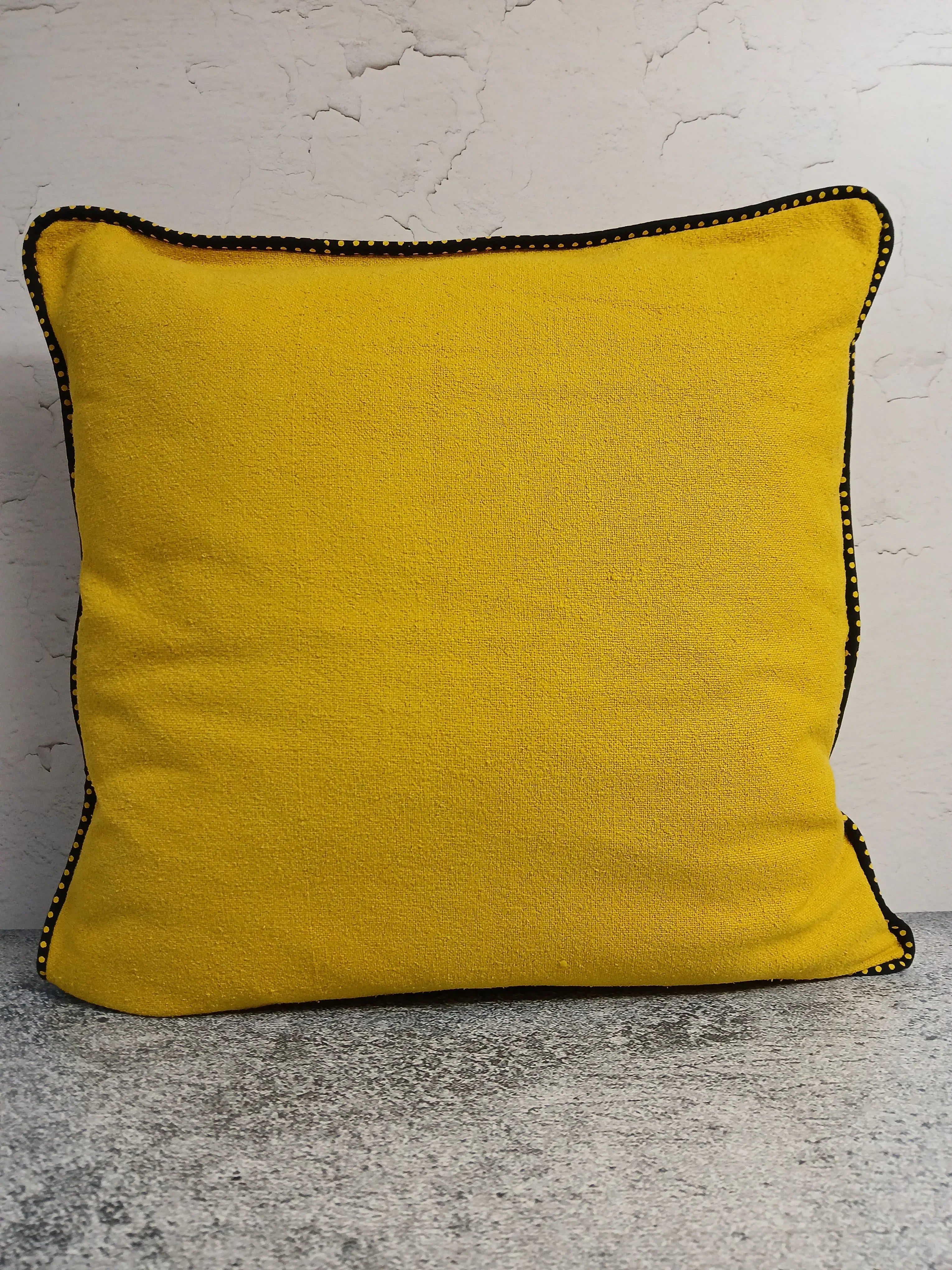 Diese handgefertigte Kissenhülle verbindet einen grob gewebten, upgecycelten Baumwollstoff in warmem Gelb mit schwarzem Shweshwe aus Südafrika, akzentuiert durch feine gelbe Punkte.